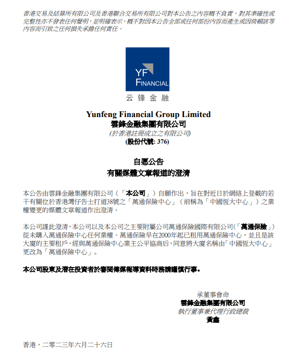 至此,外界猜測相關(guān)業(yè)權(quán)也作出變更。6月26日,云鋒金融集團對此傳聞作出澄清。公告稱,公司及公司之非全資附屬公司萬通保險國際有限公司從未購入萬通保險中心(原中國恒大中心)任何業(yè)權(quán)。