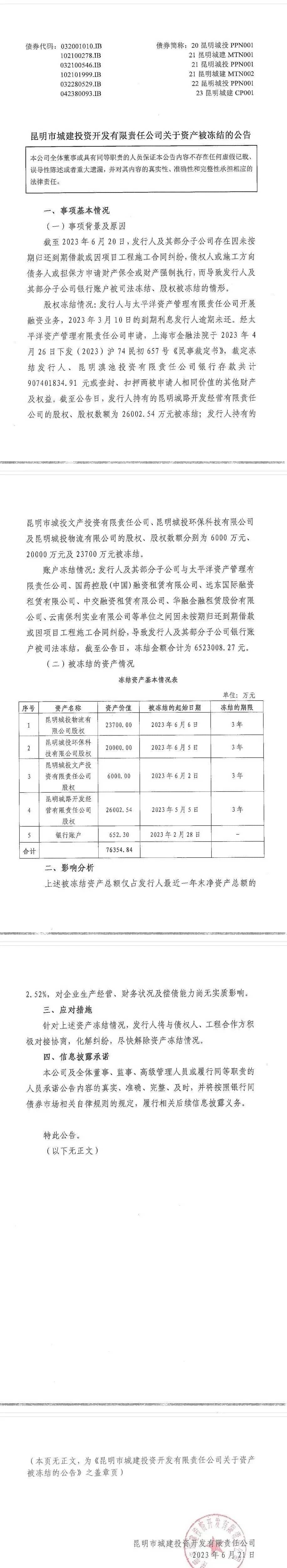 6月21日,昆明市城建投資開發(fā)有限責(zé)任公司發(fā)布公告,截至2023年6月20日,發(fā)行人及其部分子公司存在因未按期歸還到期借款或因項目工程施工合同糾紛,債權(quán)人或施工方向債務(wù)人或擔(dān)保方申請財產(chǎn)保全或財產(chǎn)強制執(zhí)行,而導(dǎo)致發(fā)行人及其部分子公司銀行賬戶被司法凍結(jié)、股權(quán)被凍結(jié)合計7.64億。