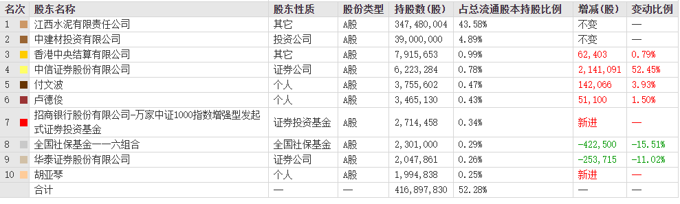 亞泰集團(tuán)十大股東中,海螺水泥以持股比例5.31%排名第2,北方水泥持股3.99%排名第6,冀東水泥持股3.34%排名第10。