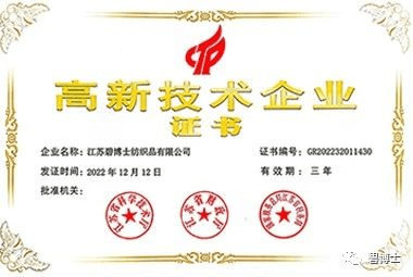 近日,江蘇碧博士紡織品有限公司(以下簡稱“碧博士”)成功獲得國家“高新技術(shù)企業(yè)”認(rèn)定殊榮,正式邁入國家高新技術(shù)企業(yè)行列。本次成功入選高新技術(shù)企業(yè),是國家相關(guān)部門對碧博士多年來工作的肯定,也是碧博士產(chǎn)品研發(fā)實(shí)力與創(chuàng)新能力的體現(xiàn)。