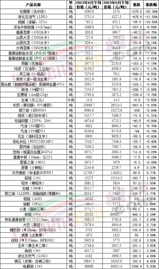 環(huán)比5月下旬,50種生產(chǎn)物資中有30種下跌,其中包含煤炭、液化石油氣、水泥、柴油及多種化工品,另外柴油、汽油價格也處于下跌列表中。
