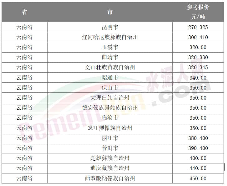據(jù)水泥人網(wǎng)了解,或因云南省內(nèi)各區(qū)域錯峰生產(chǎn)執(zhí)行力度不同,各區(qū)域水泥差價較大,低價水泥對多地市場都有沖擊。水泥人網(wǎng)信息中心監(jiān)控數(shù)據(jù)顯示,目前云南省內(nèi)參考報價在270-450元/噸,昆明區(qū)域P.O42.5散裝水泥報價在270-325元/噸不等,不同企業(yè)最大差價在55元/噸左右。