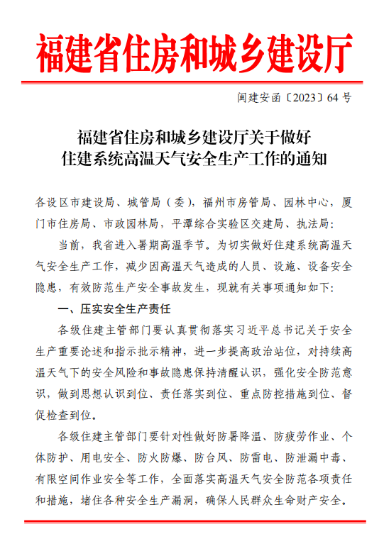 福建省住建廳要求嚴(yán)格落實(shí)日最高氣溫在35°C以上時(shí),11:00-15:00嚴(yán)禁室外露天作業(yè)的有關(guān)要求。