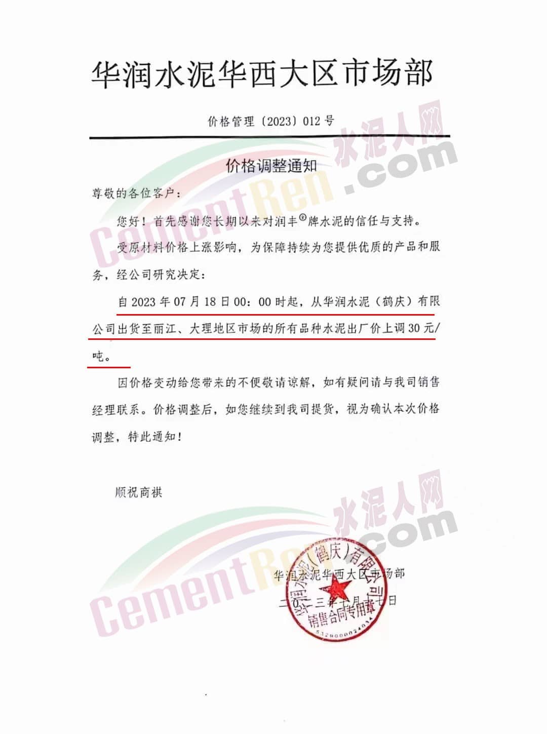 華潤水泥華西大區(qū)市場部通知受原材料價格上漲影響,為保障持續(xù)為客戶提供優(yōu)質(zhì)的產(chǎn)品和服務,經(jīng)公司研究決定,自2023年7月18日0時起,從華潤水泥(鶴慶)有限公司出貨至麗江、大理地區(qū)市場的所有品種水泥出廠價上調(diào)30元/噸。