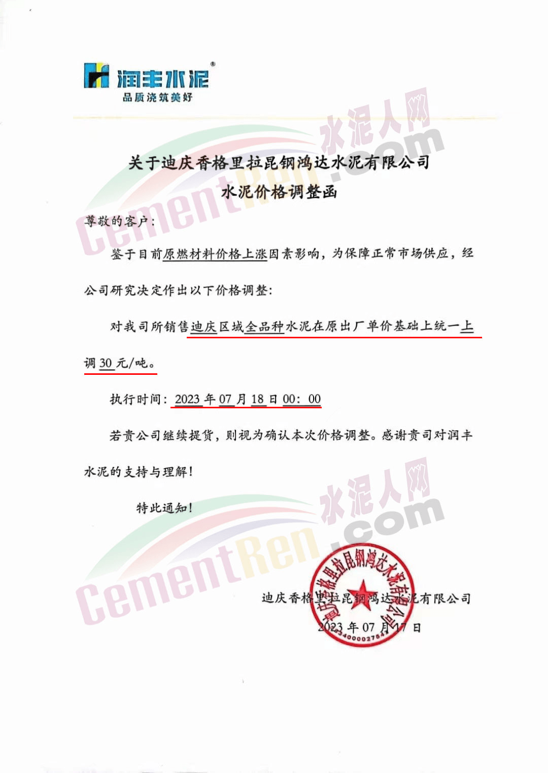迪慶香格里拉昆鋼鴻達水泥有限公司通知鑒于目前原燃材料價格上漲因素影響,為保障正常市場供應,經(jīng)公司研究決定作出以下價格調(diào)整,對銷售迪慶區(qū)域全品種水泥在原出廠單價基礎(chǔ)上統(tǒng)一上調(diào)30元/噸,執(zhí)行時間2023年7月18日0時。