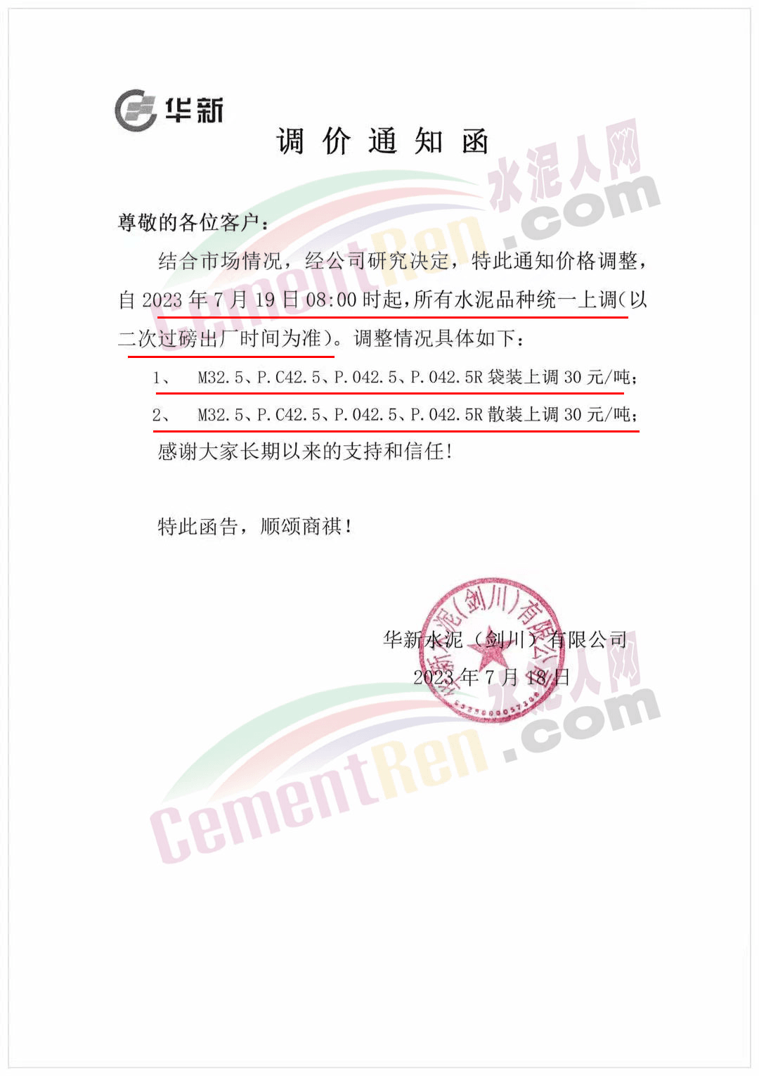華新水泥(劍川)有限公司通知結(jié)合市場情況,經(jīng)公司研究決定,特此通知價格調(diào)整。自2023年7月19日8時起,所有水泥品種統(tǒng)一上調(diào)30元/噸。