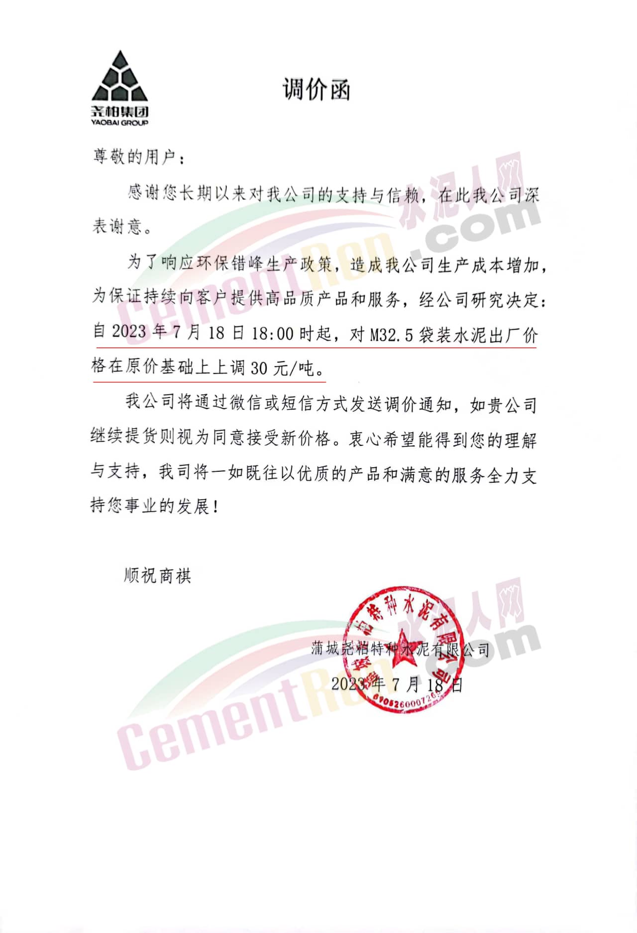 蒲城堯柏特種水泥有限公司通知,為了響應環(huán)保錯峰生產(chǎn)政策,造成公司生產(chǎn)成本增加。為保證持續(xù)向客戶提供高品質(zhì)產(chǎn)品和服務,經(jīng)公司研究決定,自2023年7月18日18時起,對M32.5袋裝水泥出廠價格在原價基礎(chǔ)上上調(diào)30元/噸。