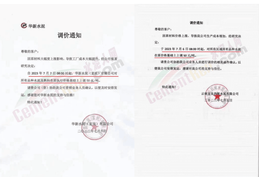 麗江古城西南水泥有限公司通知,因近期原燃材料漲價,經(jīng)公司研究決定,自2023年7月18日0時起,對所有區(qū)域的全品種水泥在原價格基礎(chǔ)上上調(diào)30元/噸。