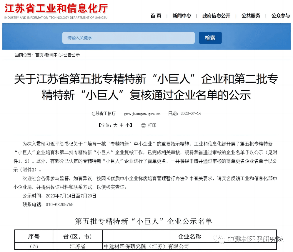 近日,根據(jù)工業(yè)和信息化部統(tǒng)一部署,江蘇省工業(yè)和信息化廳發(fā)布了《關(guān)于江蘇省第五批專精特新“小巨人”企業(yè)和第二批專精特新“小巨人”復(fù)核通過(guò)企業(yè)名單》,經(jīng)公示后,中建材環(huán)保研究院(江蘇)有限公司憑借創(chuàng)新能力強(qiáng)、質(zhì)量效益優(yōu)、行業(yè)地位高等競(jìng)爭(zhēng)力被認(rèn)定為國(guó)家級(jí)專精特新“小巨人”企業(yè)。