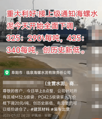 日前,安徽阜陽一貿(mào)易商通知:“臨泉海螺通知公司針對所有區(qū)域M32.5級袋、PO42.5級袋裝水泥價格下調(diào)20元/噸,創(chuàng)歷史新低,有需要的可以低價進(jìn)倉了 ”。本輪調(diào)價后,臨泉海螺M32.5袋裝水泥報價290元/噸,P.O425級袋裝水泥報價340元/噸。