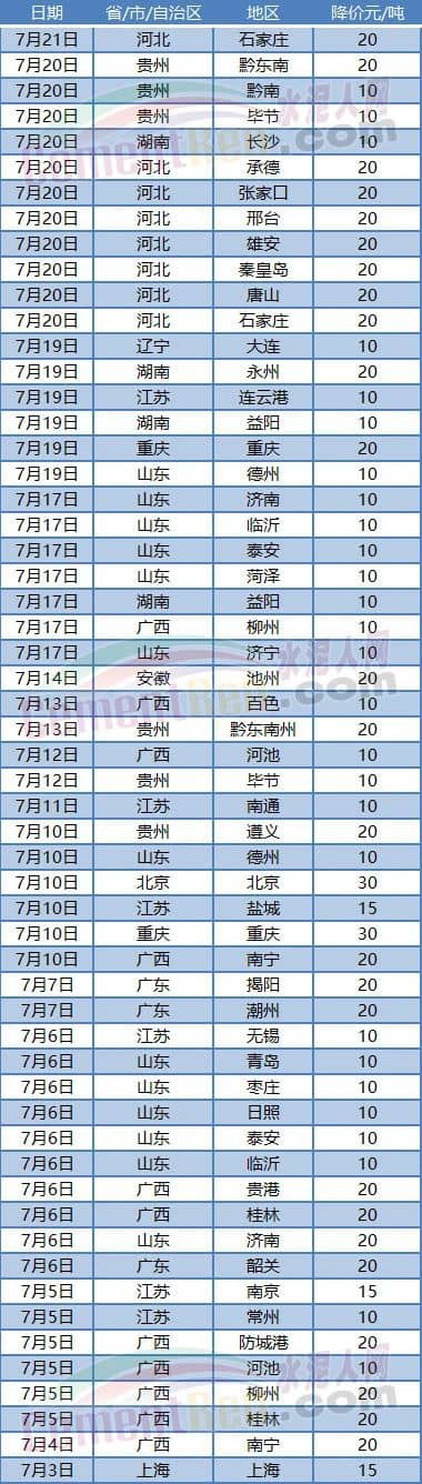 另據(jù)了解,在管理費(fèi)用,技改支出增加,但市場價格卻跌跌不休的情況下,有部分企業(yè)已在虧本銷售。盡管如此,市場降價信息仍不斷涌來。7月份以來河北、河南、山東、廣東、廣西、江蘇、安徽、湖南、遼寧、重慶、貴州等10多個區(qū)域水泥價格仍處于下行態(tài)勢。