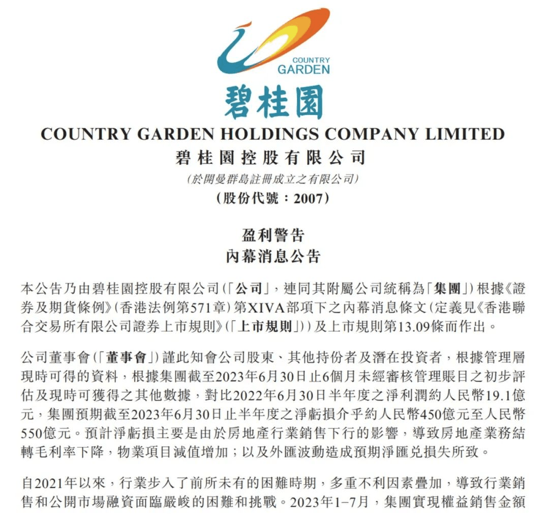 8月10日,處于輿論風(fēng)口浪尖的碧桂園以公告的方式正面回應(yīng)市場(chǎng)關(guān)切,坦承“公司遇到了自成立以來(lái)最大的困難”,公告中表示,預(yù)期截至2023年6月30日止半年度之凈虧損介乎約人民幣(下同)450億元-550億元。