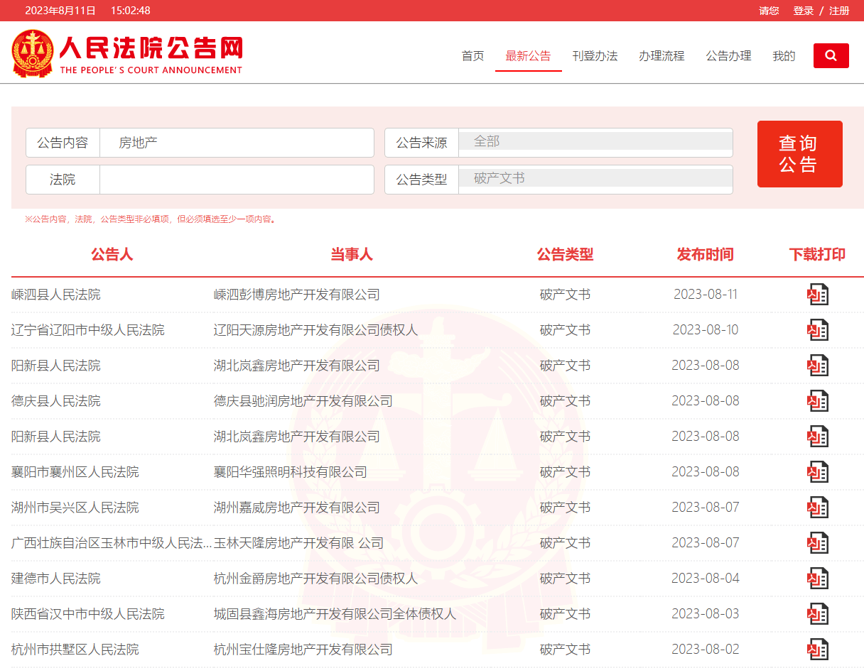據(jù)人民法院公告網(wǎng)數(shù)據(jù),2023年以來(lái)截至發(fā)稿,已有175家房地產(chǎn)相關(guān)企業(yè)發(fā)布了破產(chǎn)公告。有的因?yàn)闊o(wú)法清償?shù)狡趥鶆?wù),有的負(fù)債過(guò)高,有的資金鏈斷裂,最終紛紛申請(qǐng)破產(chǎn)清算,名下房產(chǎn)、土地慘遭處理。