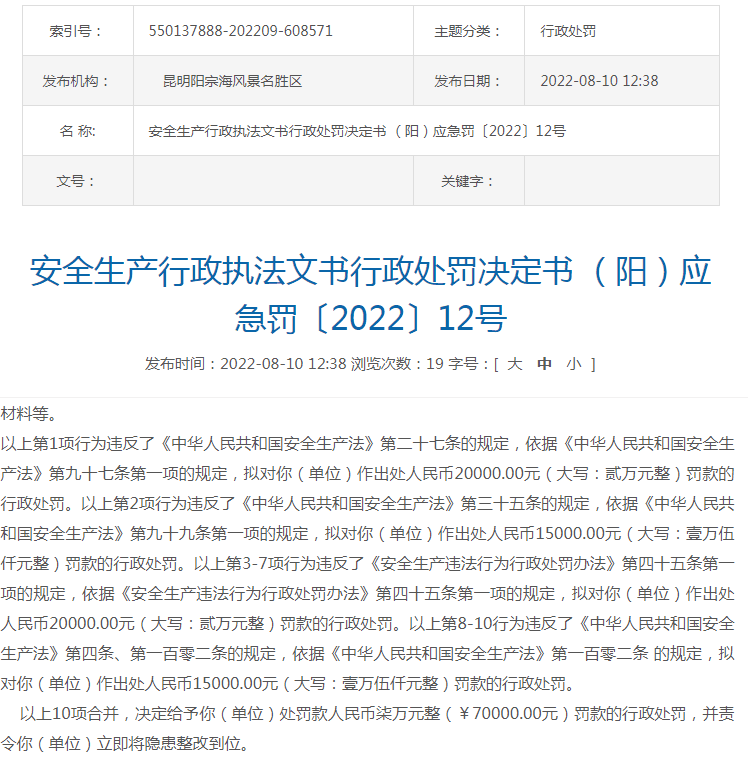 2022年8月10日,昆明陽宗海風(fēng)景名勝區(qū)管理委員會發(fā)布《安全生產(chǎn)行政執(zhí)法文書行政處罰決定書(陽)應(yīng)急罰〔2022〕12號》稱:昆明市明良匯江水泥制造有限公司大馬山石灰?guī)r礦在生產(chǎn)過程中存在未配備注冊安全工程師、采礦技術(shù)員,礦山+1980m水平臺階存在凹陷,該區(qū)域未設(shè)置警示標(biāo)識,礦山未編制挖掘機、裝載機、推土機操作規(guī)程等違法違規(guī)行為,昆明陽宗海風(fēng)景名勝區(qū)管理委員會對該水泥廠作出7萬元處罰。