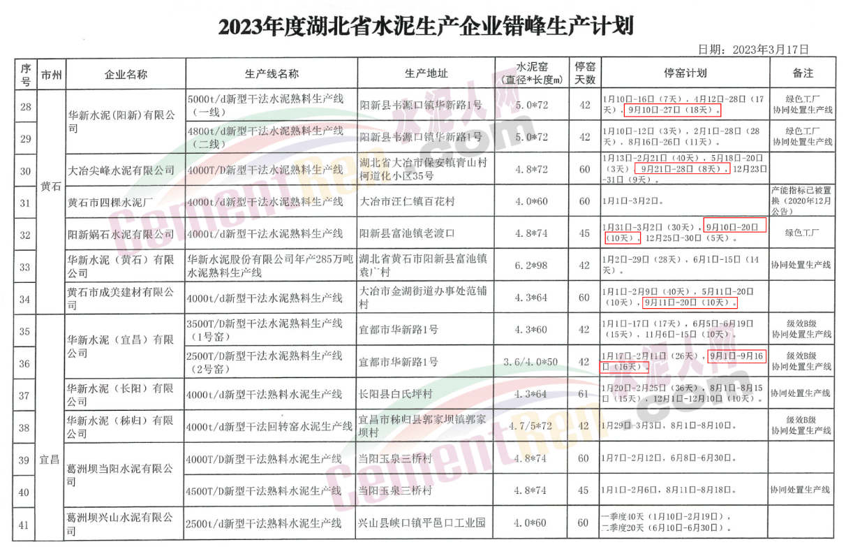 湖北省水泥生產(chǎn)企業(yè)2023年度錯峰生產(chǎn)計劃顯示,22家水泥企業(yè)23條熟料線三季度將涉及停窯限產(chǎn)。其中明確于9月份停窯限產(chǎn)的10家企業(yè)停窯時間從2天至18天不等。