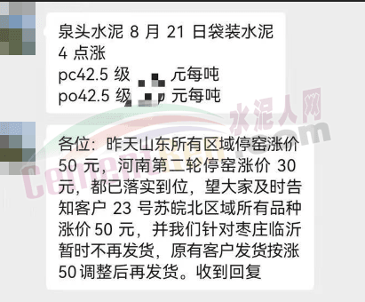 據(jù)市場反饋,8月20日棗莊中聯(lián)、華沃已上調(diào)報價30元/噸;21日濟寧海螺上調(diào)30元/噸。22日-23日蘇北徐州中聯(lián)水泥、龍山水泥將上調(diào)報價。江蘇徐州一經(jīng)銷商通知稱,水泥又要漲價了,有建房子要快下手了,預(yù)計上漲30~50元/噸。