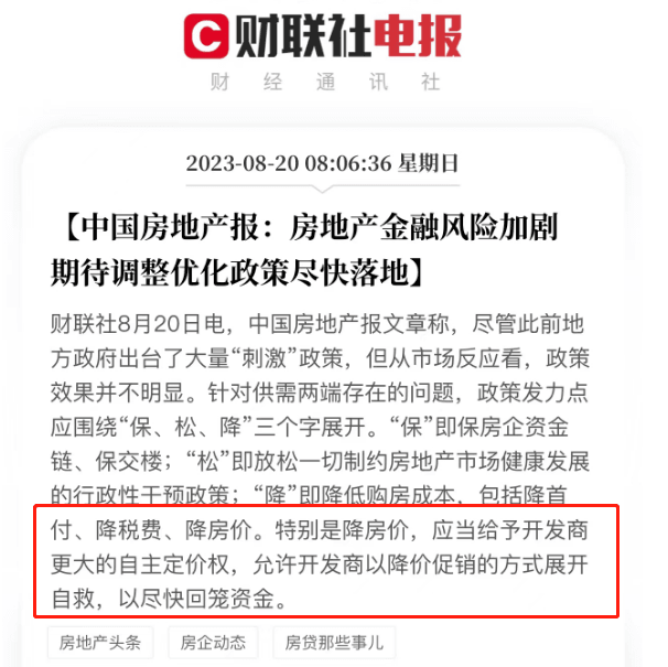 代表官方的中國(guó)房地產(chǎn)報(bào)發(fā)文稱:房地產(chǎn)金融風(fēng)險(xiǎn)加劇期待調(diào)整優(yōu)化政策盡快落地。其中提到最重要的一點(diǎn),應(yīng)當(dāng)給予開發(fā)商更大的自主定價(jià)權(quán),允許開發(fā)商以降價(jià)促銷的方式展開自救,以盡快回籠資金。