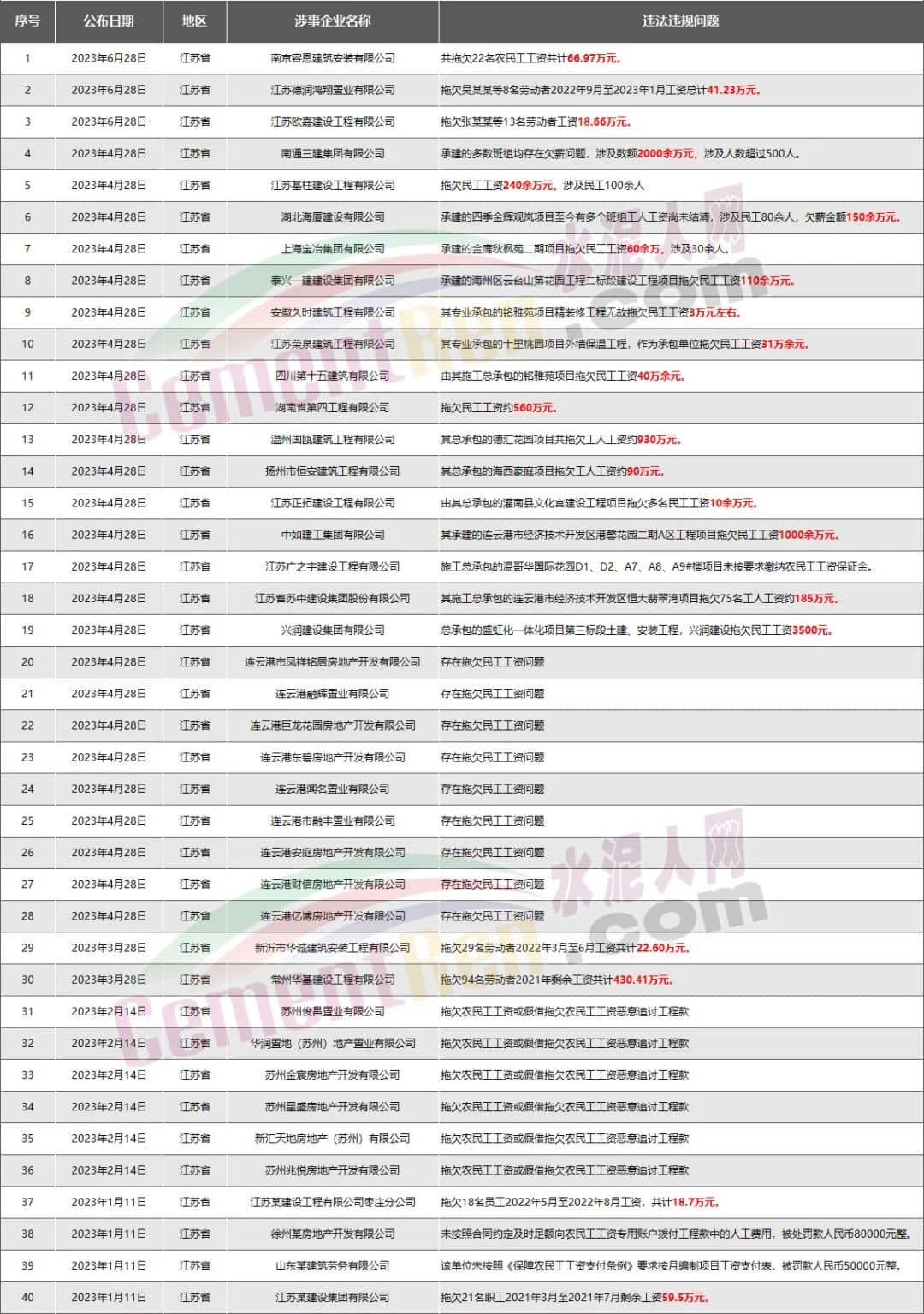 6月1日,江蘇省住房和城鄉(xiāng)建設廳公開消息,對2023年元旦春節(jié)期間因拖欠農(nóng)民工工資引發(fā)群體性事件的126家企業(yè)予以全省范圍內(nèi)限制建筑市場準入,對44家企業(yè)予以全省通報批評。
