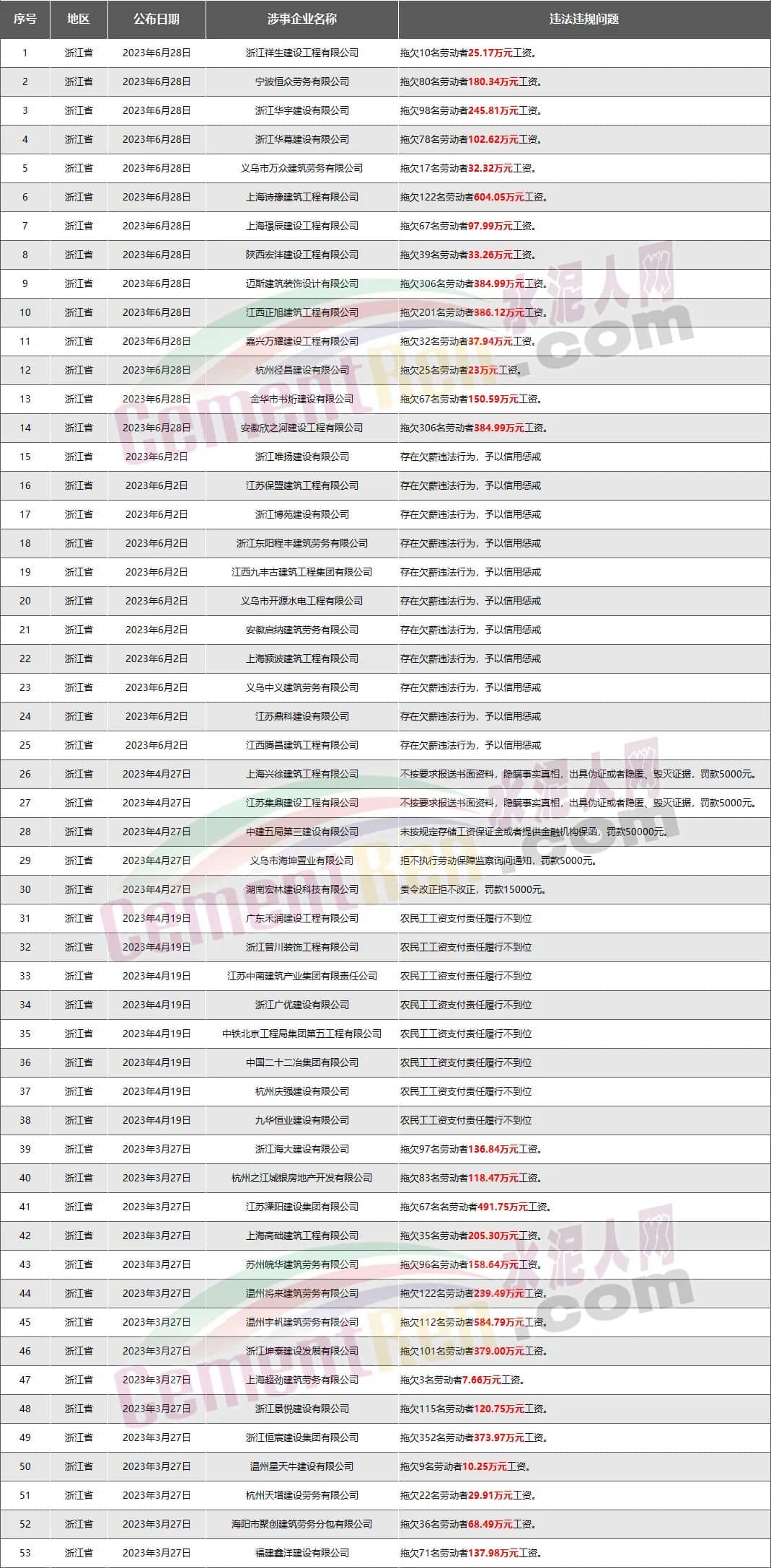 浙江省53家房企、建企欠薪被通報或處罰,涉及金額5752萬元