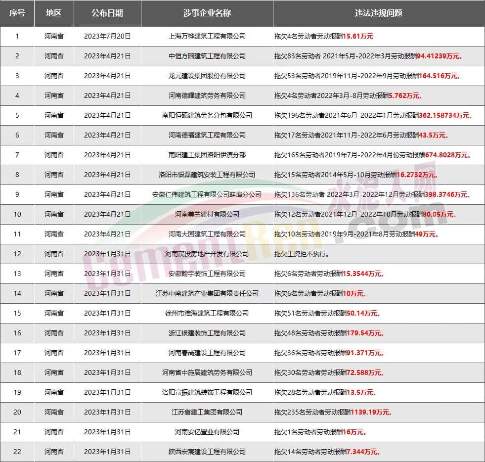 河南省22家房企、建企欠薪被通報或處罰,涉及金額3499.43萬元