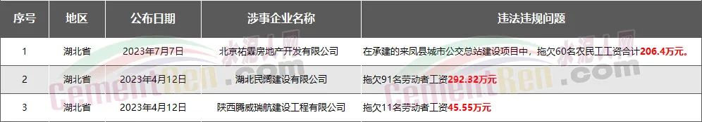 湖北省3家房企、建企欠薪被通報或處罰,涉及金額544.27萬元
