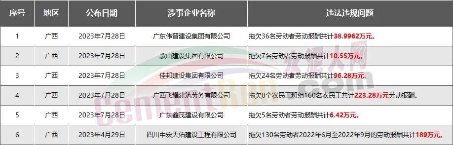 廣西6家房企、建企欠薪被通報或處罰,涉及金額564.52萬元