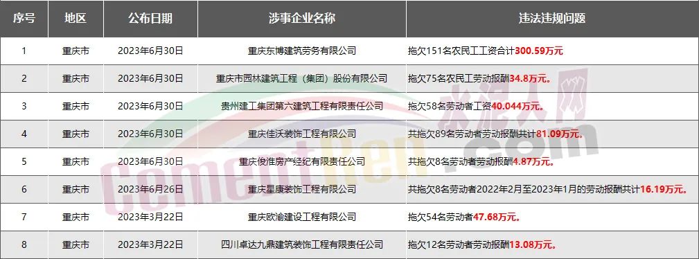 重慶市8家房企、建企欠薪被通報或處罰,涉及金額538.34萬元