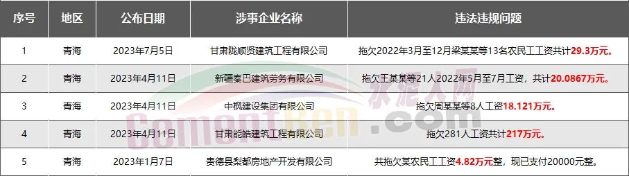 青海省5家房企、建企欠薪被通報或處罰,涉及金額289.32萬元