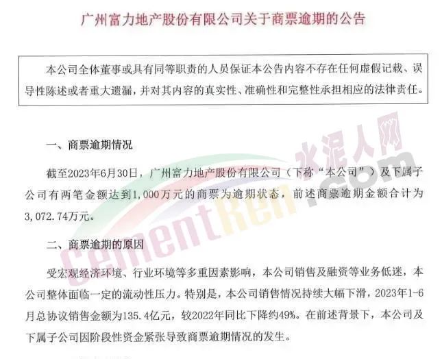 截至6月30日,廣州富力及下屬子公司有兩筆金額達(dá)到1000萬元的商票為逾期狀態(tài),前述商票逾期金額合計(jì)為3072.74萬元。此前,富力地產(chǎn)由于商票逾期,被債權(quán)人廣東祥正商貿(mào)有限公司、廣州市廣豐混凝土有限公司以“不能清償?shù)狡趥鶆?wù)且明顯缺乏清償能力”申請(qǐng)破產(chǎn)重整。