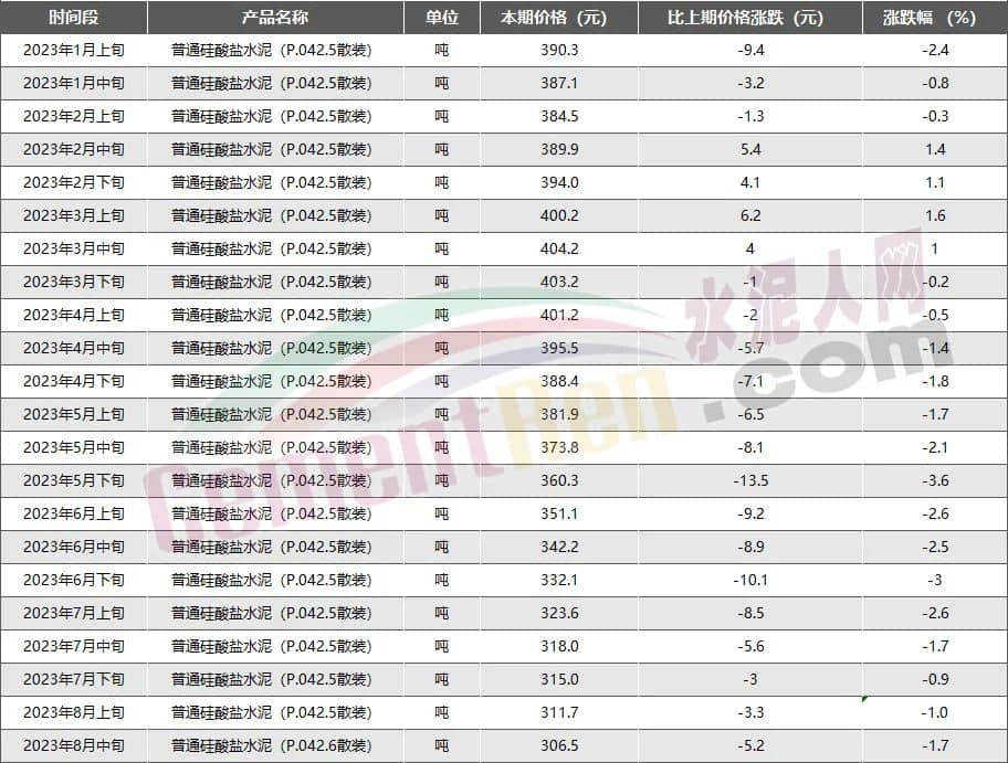 近日,國家統(tǒng)計局公布2023年8月中旬流通領(lǐng)域重要生產(chǎn)資料市場價格變動情況顯示,普通硅酸鹽水泥(P.O42.5散裝)水泥報價306.5元/噸,已是自3月下旬以來連續(xù)第15次價格下跌,且為自5月上旬以來第11次突破年內(nèi)最低價?! D片