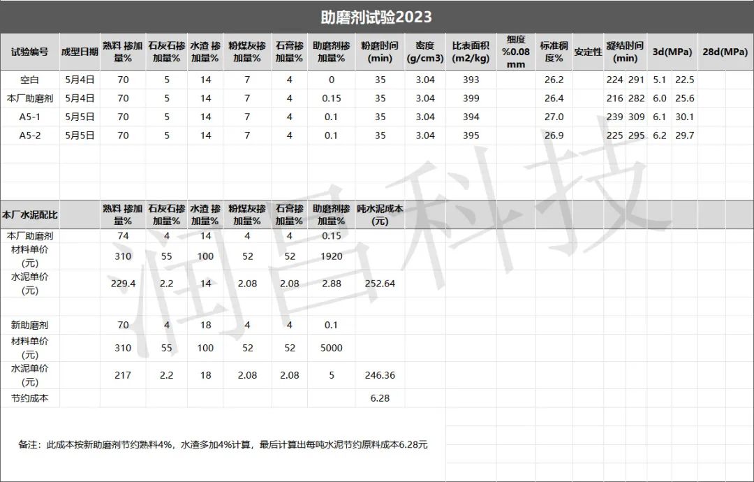 對比該水泥廠原先使用的助磨劑,使用潤昌科技A5-1、A5-2新型助磨劑水泥三天強度分別增加4.5MPa,4.1MPa,熟料摻量減少4%,混合材摻量增加4%,綜合計算下來每噸水泥節(jié)約原料成本6.28元。