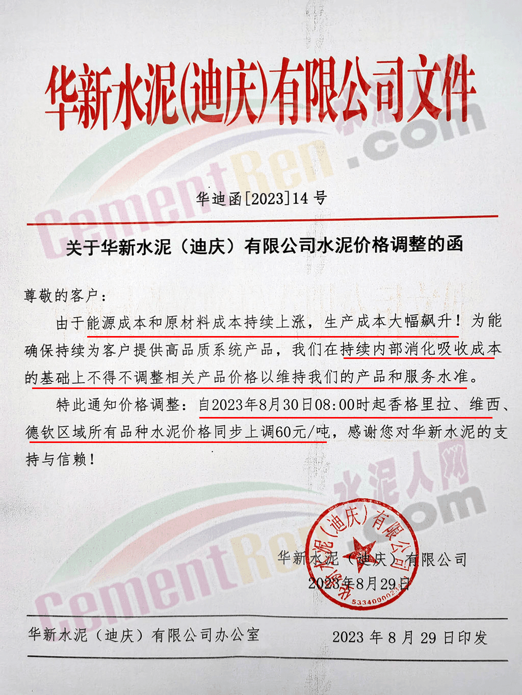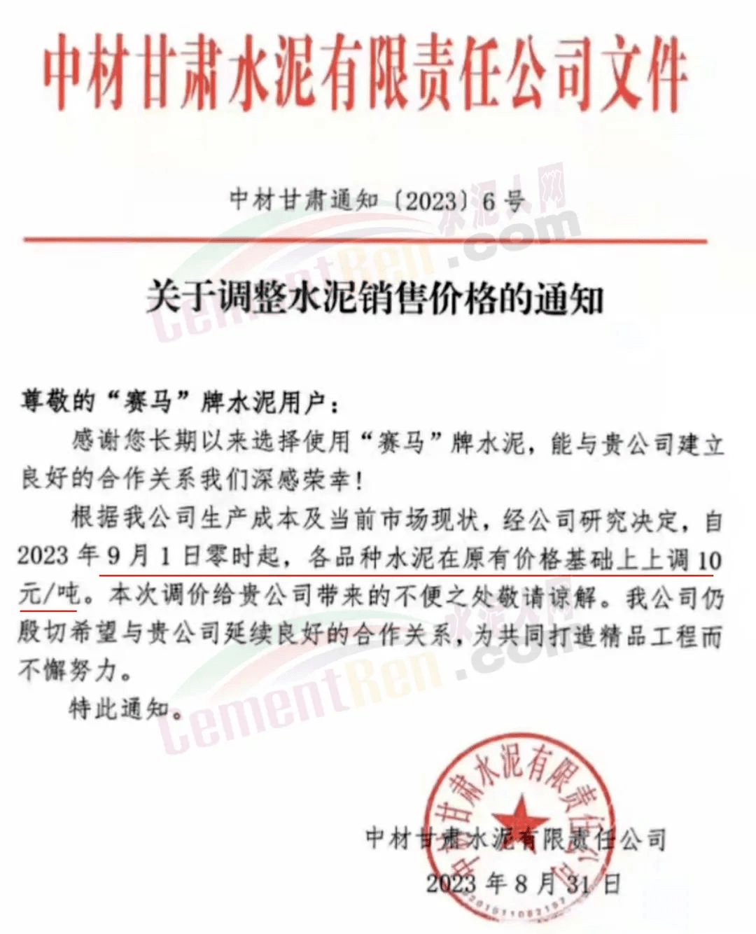 福建三明南方水泥有限公司通知,根據(jù)目前市場(chǎng)行情,經(jīng)公司研究決定,自2023年9月3日零時(shí)起公司各品種袋裝、散裝水泥出廠價(jià)在原有基礎(chǔ)上上調(diào)30元/噸。