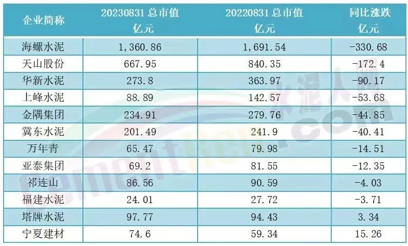 對比部分上市企業(yè)2022年同比市值下跌情況可見,近一年來包括海螺水泥、冀東水泥、華新水泥等企業(yè)在內(nèi)的10家企業(yè)市值下滑合計(jì)達(dá)766.79億元,其中海螺水泥一年內(nèi)總市值下滑達(dá)330.68億元。