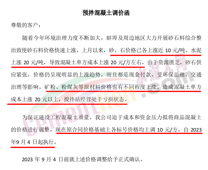 為保證建設工程混凝土質(zhì)量,公司迫于成本和資金壓力擬將商品混凝土的價格進行調(diào)整,自2023年9月4日起在原合同價格基礎上各標號價格上調(diào)10元/方。