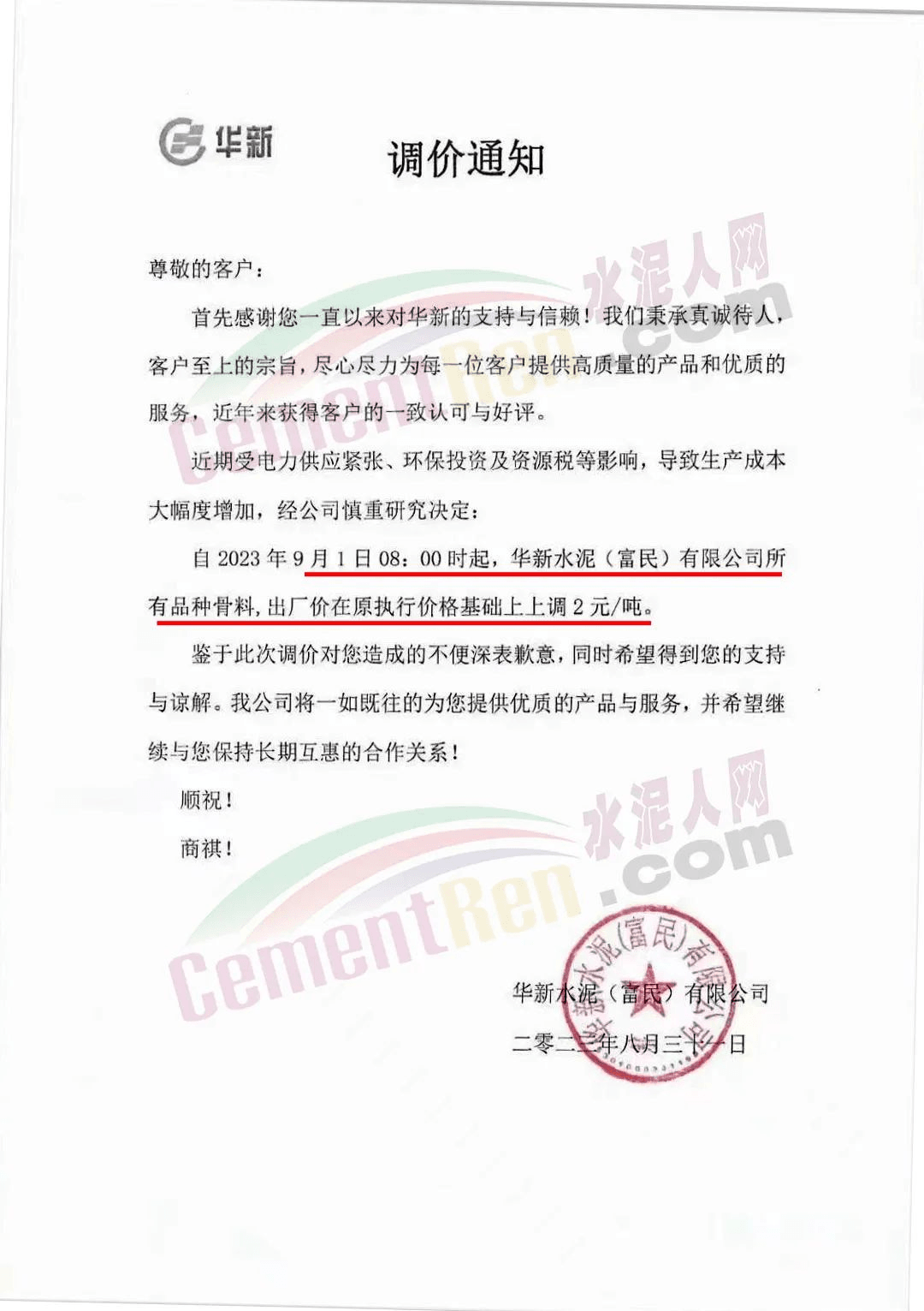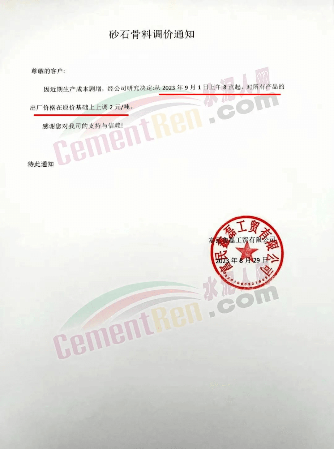 華新水泥(富民)有限公司通知稱,受電力供應緊張、環(huán)保投資及資源稅等影響,導致生產(chǎn)成本大幅度增加,經(jīng)公司慎重研究決定:自2023年9月1日8時起,公司所有品種骨料出廠價在原執(zhí)行價格基礎上上調(diào)2元/噸。
