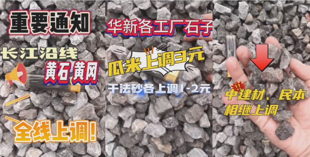 沿江貿(mào)易商也于8月30日通知,黃石、黃岡華新各工廠石子瓜米上調(diào)3元/噸,干法砂上調(diào)1-2元/噸。中建材、民本相繼跟進上調(diào)。并表示,長江沿線多家砂石價格上漲,九月中下旬或?qū)⒌竭_需求峰值。