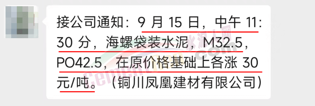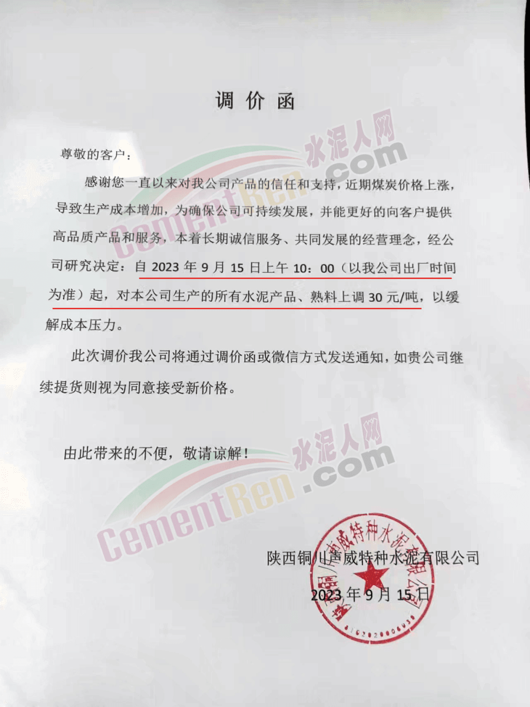 華新金龍水泥(鄖縣)有限公司通知,鑒于當前原材料價格上漲,及市場行情變化,公司決定于2023年9月14日起所有品種水泥價格上調(diào)30元/噸。