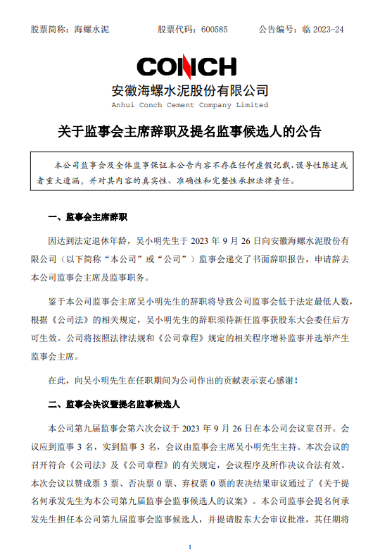 海螺水泥公告稱,因達(dá)到法定退休年齡,吳小明先生于2023年9月26日向安徽海螺水泥股份有限公司監(jiān)事會(huì)遞交了書面辭職報(bào)告,申請(qǐng)辭去本公司監(jiān)事會(huì)主席及監(jiān)事職務(wù)。