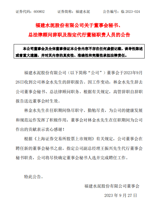 福建水泥發(fā)布公告稱,董事會(huì)于2023年9月26日收到公司林金水先生的辭職報(bào)告。因工作變動(dòng),林金水先生辭去公司董事會(huì)秘書、總法律顧問(wèn)職務(wù)。根據(jù)有關(guān)規(guī)定,高管辭職自辭職報(bào)告送達(dá)董事會(huì)時(shí)生效。