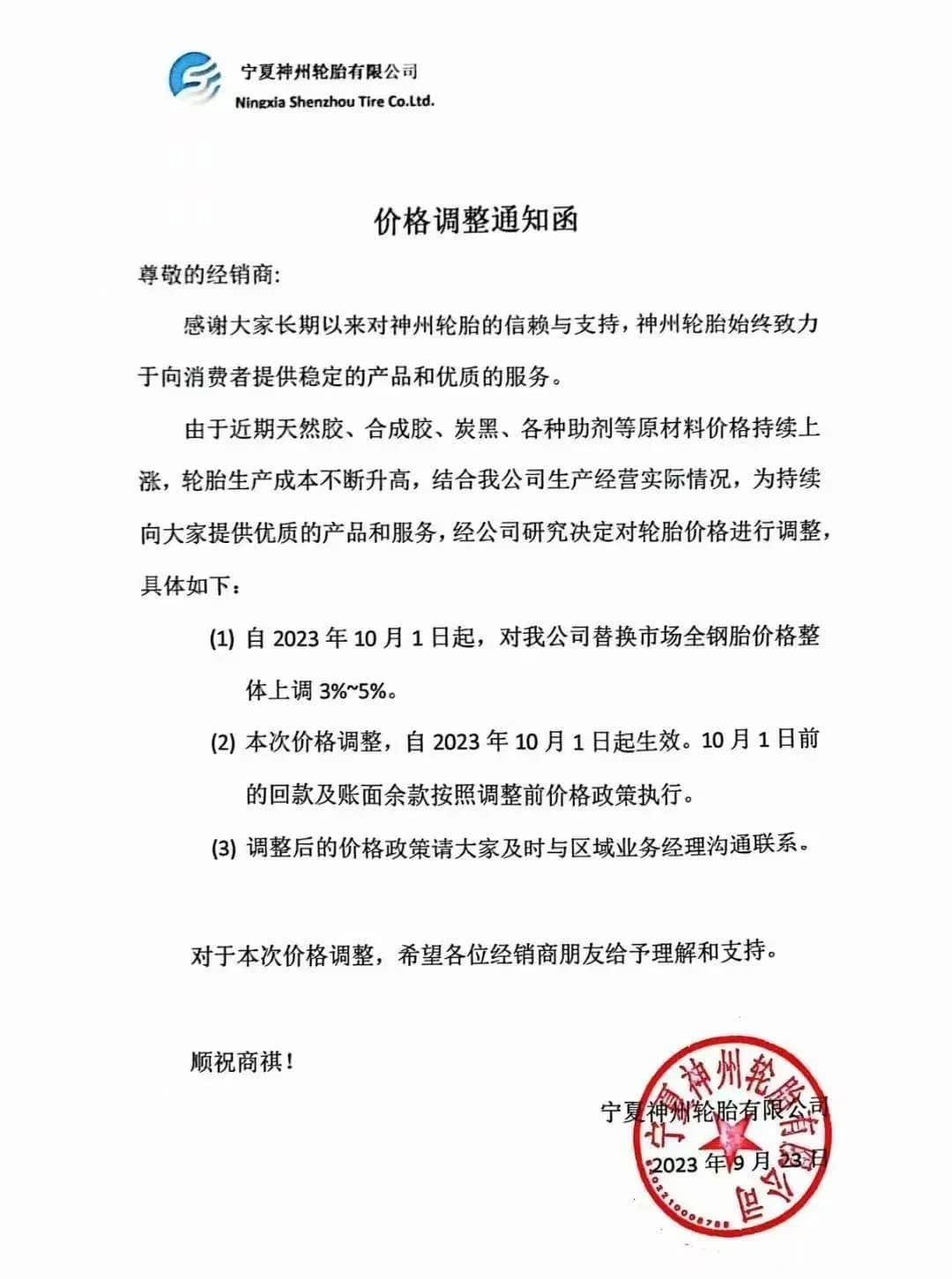 寧夏神州輪胎:自10月1日起,對(duì)替換市場(chǎng)全鋼胎價(jià)格整體上調(diào)3%—5%。