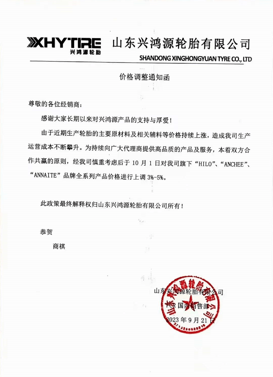 山東興鴻源輪胎:10月1日起,將對(duì)旗下“HILO”“ANCHEE”“ANNAITE”品牌全系列產(chǎn)品價(jià)格進(jìn)行上調(diào)3%—5%。