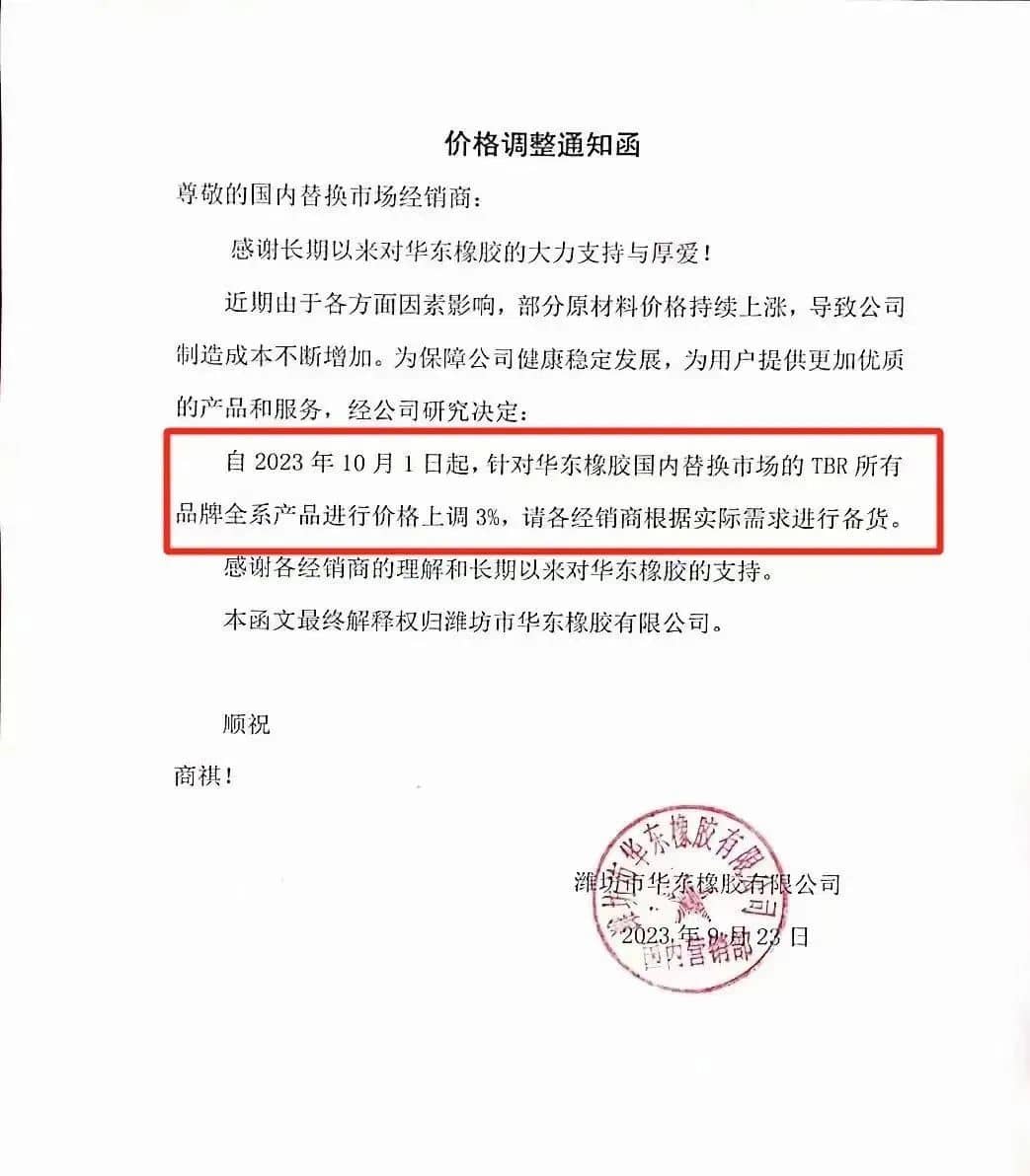 濰坊市華東橡膠:10月1日起,針對(duì)華東橡膠國(guó)內(nèi)替換市場(chǎng)的TBR所有品牌全系產(chǎn)品進(jìn)行價(jià)格上調(diào)3%。