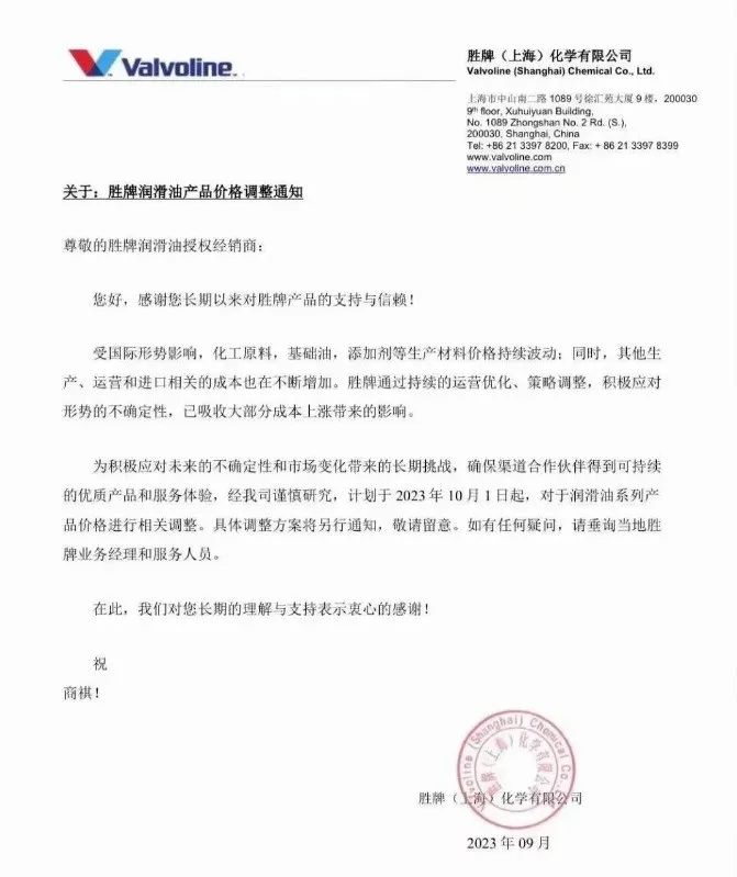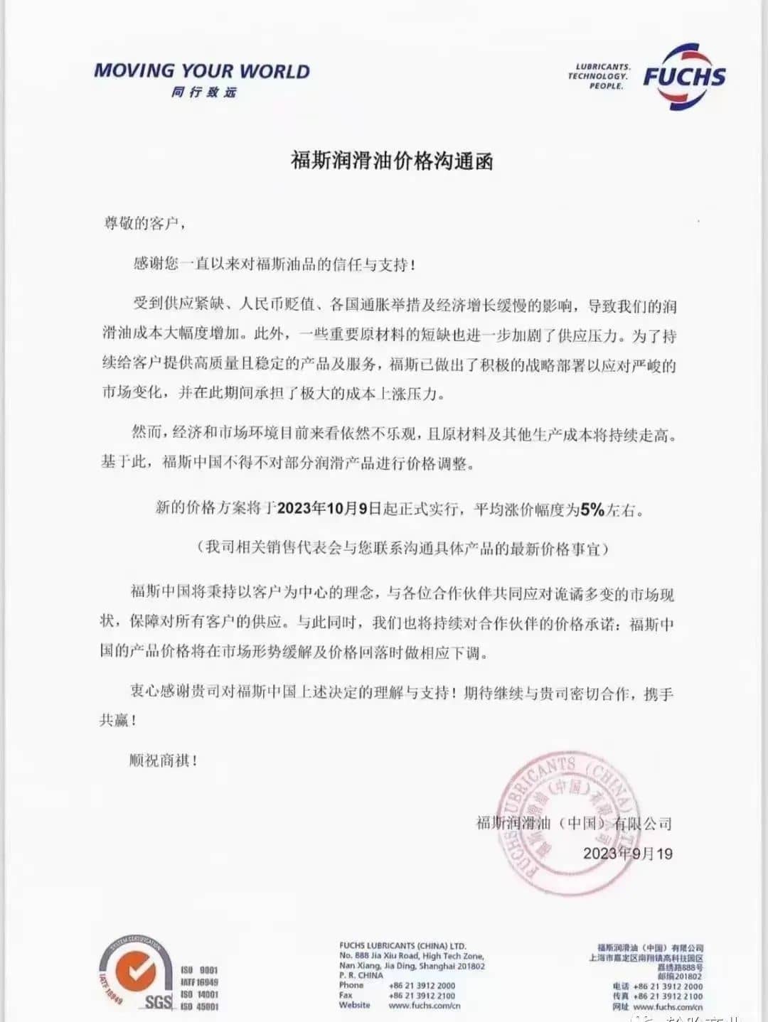 司能潤(rùn)滑油:自10月起,能部分產(chǎn)品價(jià)格上調(diào)5%—10%不等。