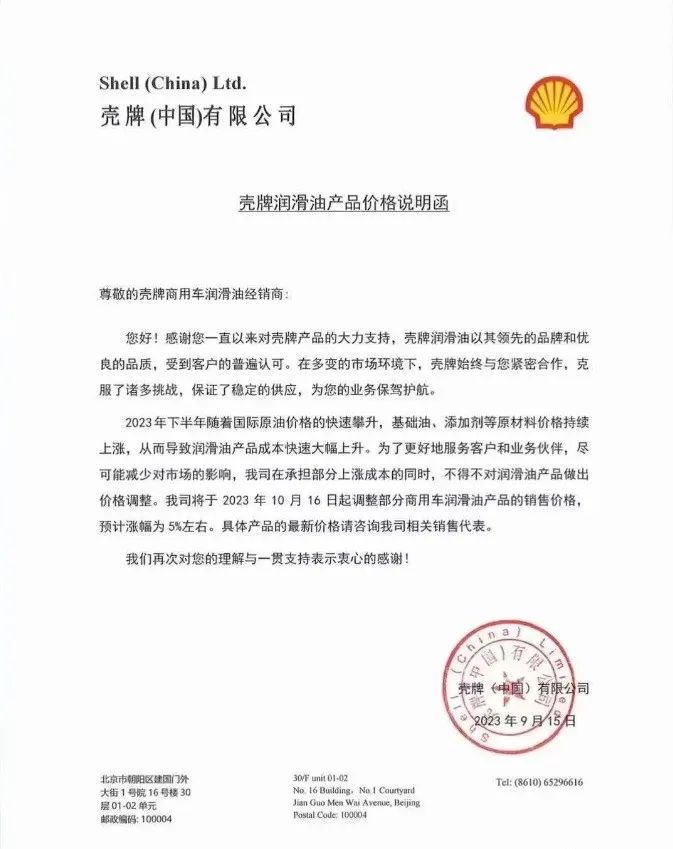 殼牌中國(guó):10月16日起,調(diào)整部分商用車(chē)潤(rùn)滑油售價(jià),預(yù)計(jì)漲幅5%左右。