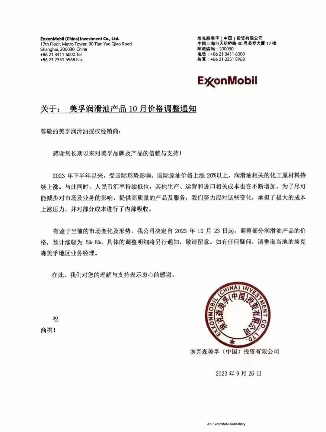 埃克森美孚:自10月23日起,調(diào)整部分潤(rùn)滑油產(chǎn)品的價(jià)格,預(yù)計(jì)漲幅為5%—8%。
