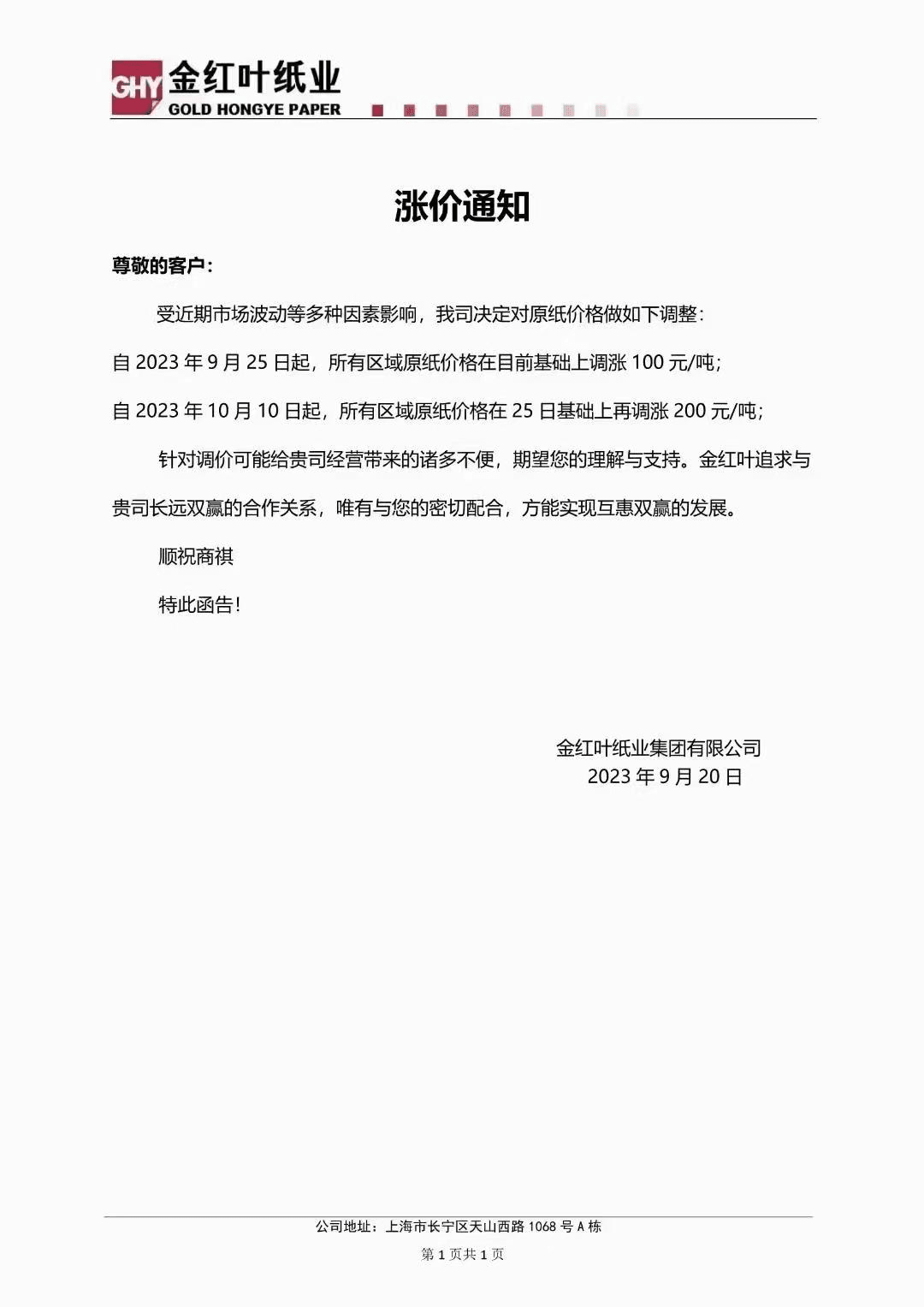 金紅葉紙業(yè):受近期市場(chǎng)波動(dòng)等多種因素影響,我司決定對(duì)原紙價(jià)格做如下調(diào)整自2023年9月25日起所有區(qū)域原紙價(jià)格在目前基礎(chǔ)上調(diào)漲100元/噸,自2023年10月10日起所有區(qū)域原紙價(jià)格在25日基礎(chǔ)上再調(diào)漲200元/噸。
