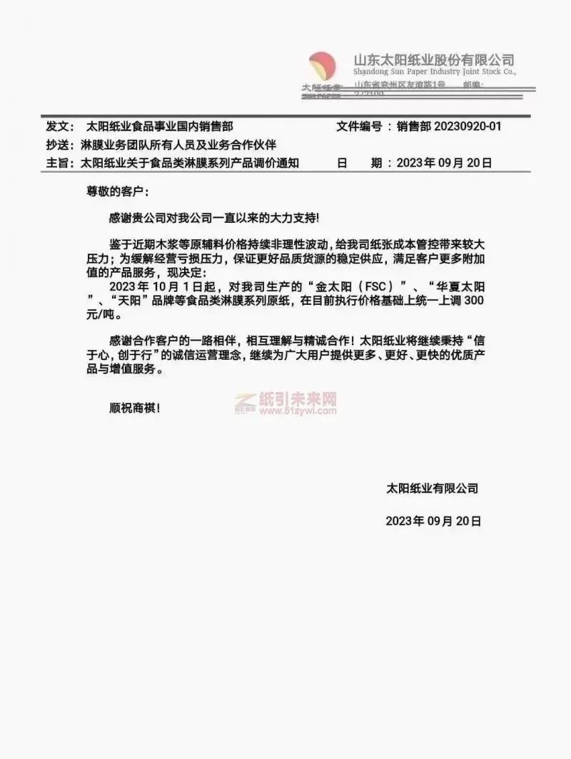 山東太陽(yáng)紙業(yè):10月1日起,對(duì)“金太陽(yáng)(FSC)”華夏太陽(yáng)“天陽(yáng)”品牌等食品類(lèi)淋膜系列原紙,在目前執(zhí)行價(jià)格基礎(chǔ)上統(tǒng)一上調(diào)300元/噸。