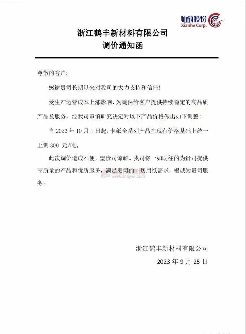 浙江鶴豐新材料:自10月1日起,卡紙全系列產(chǎn)品在現(xiàn)有價(jià)格基礎(chǔ)上統(tǒng)一上調(diào)300元/噸。