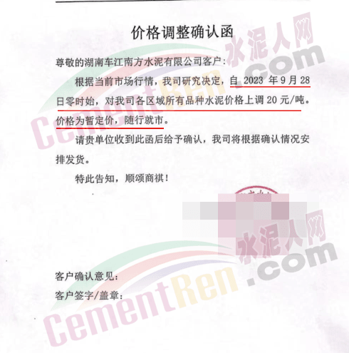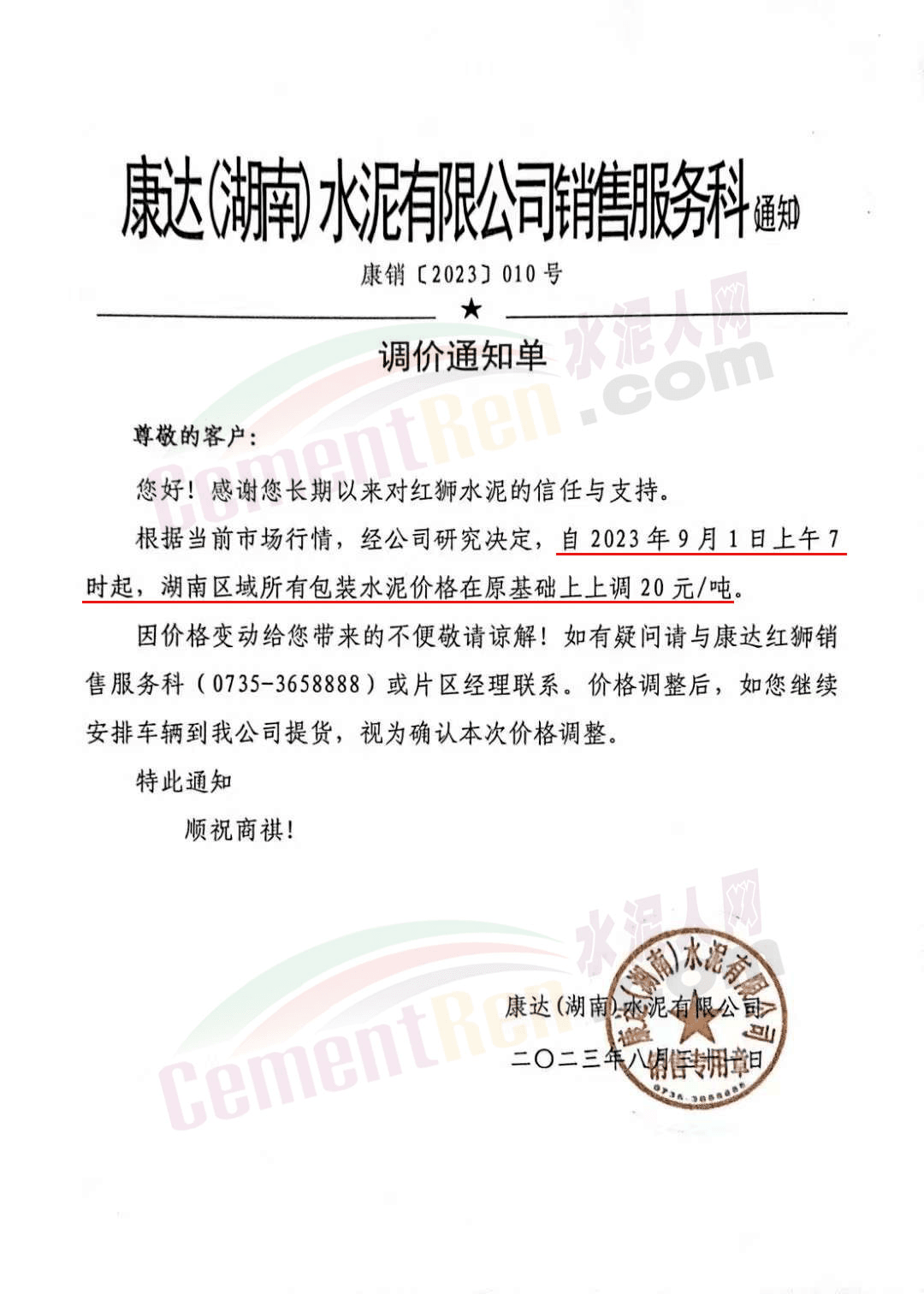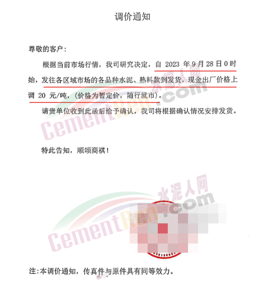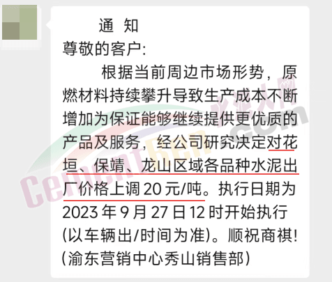 日前,重慶某品牌水泥渝東營銷中心秀山銷售部通知,根據(jù)周邊市場形勢,原燃材料持續(xù)攀升導(dǎo)致生產(chǎn)成本不斷增加,經(jīng)公司研究決定從2023年9月27日12時開始對花垣、保靖、龍山區(qū)域各品種水泥出廠價格上調(diào)20元/噸。
