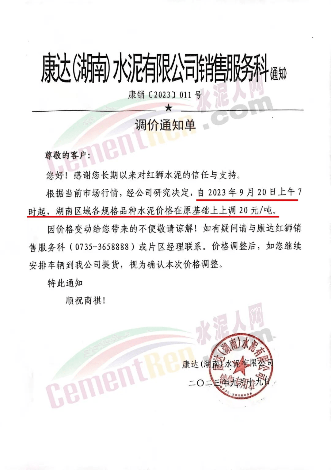 紅獅水泥旗下康達(湖南)水泥有限公司分別于9月1日,9月20日,9月28日連續(xù)三次通知上調(diào)水泥報價,累計上調(diào)60元/噸。